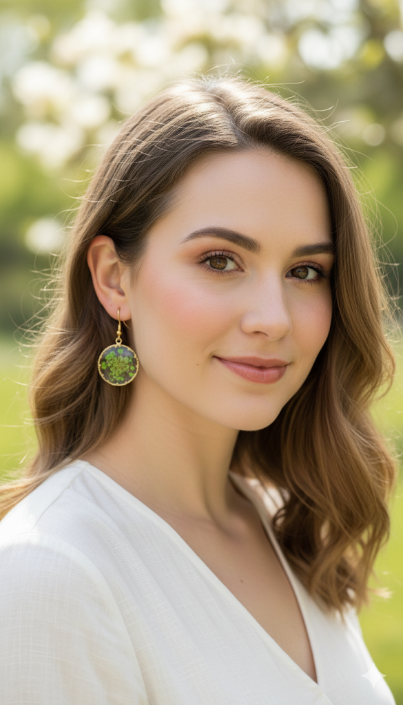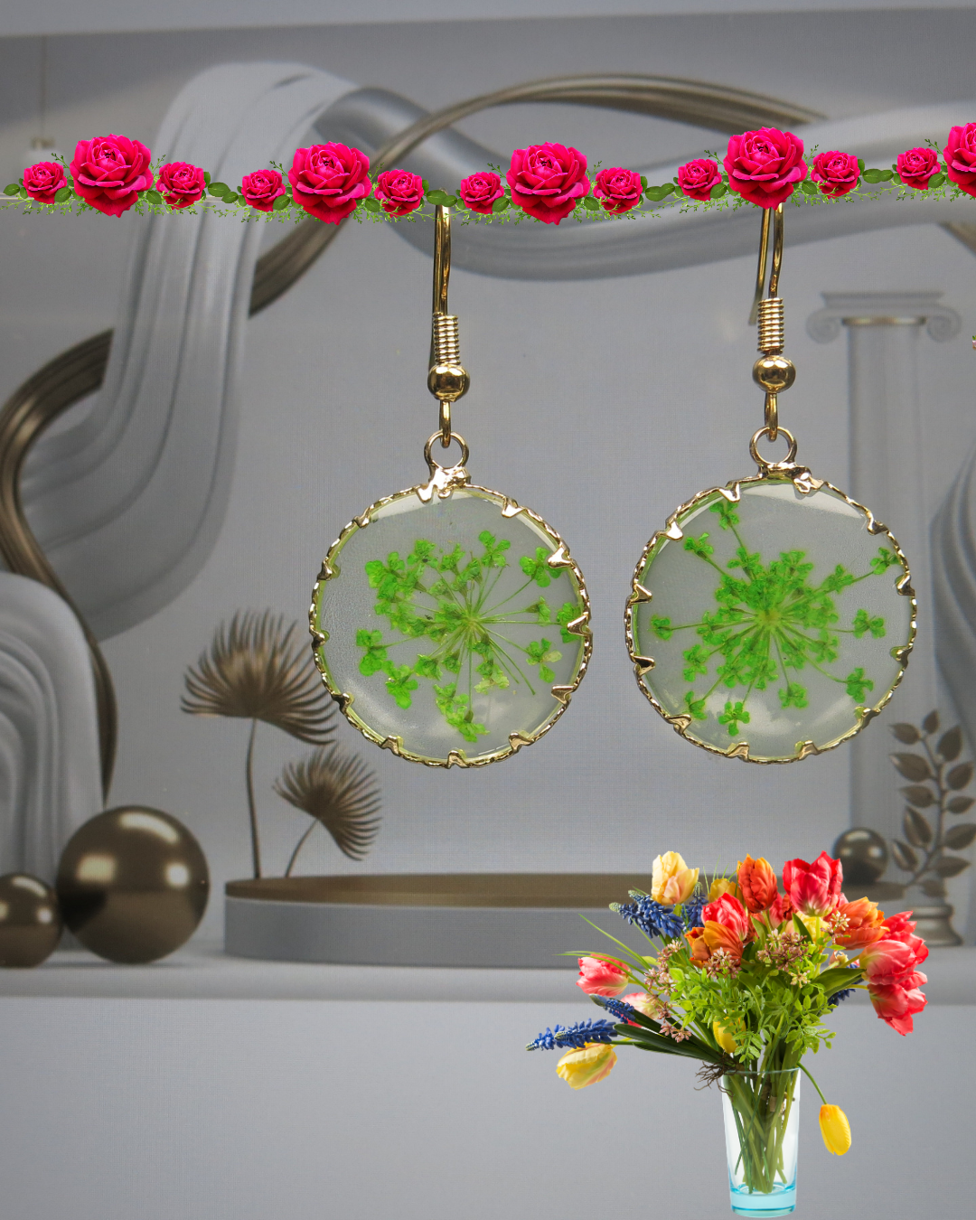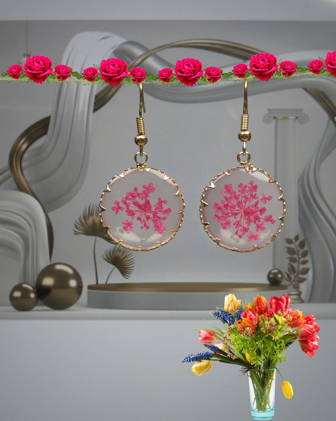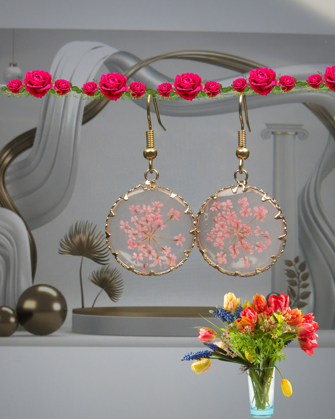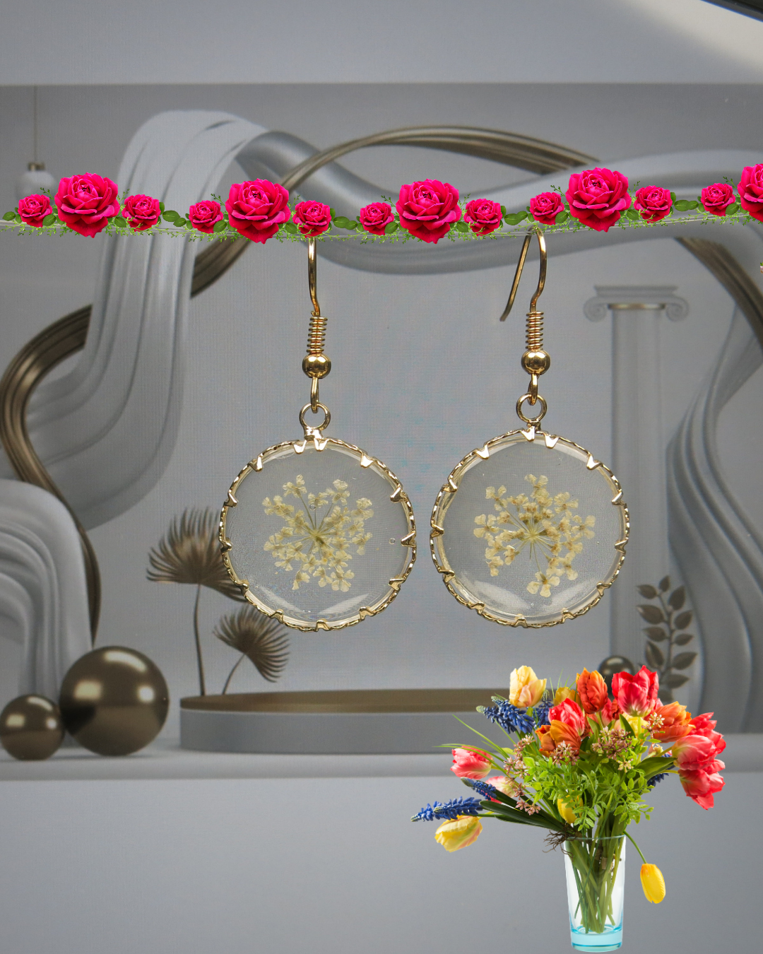 Golden Circle Resin Earrings: Real Pressed Flowers, Hypoallergenic